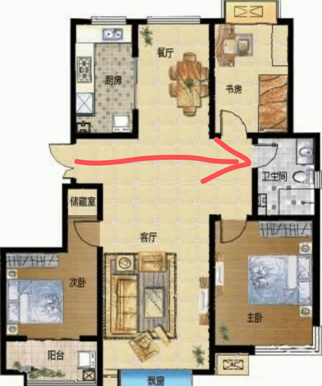 此外,这种布局也不够美观——从卫生间出来时,很可能与门口的人直接对视,尴尬不已。如果不得已选择了这类户型,建议装修时在玄关处增设遮挡,或调整卫生间门的朝向。